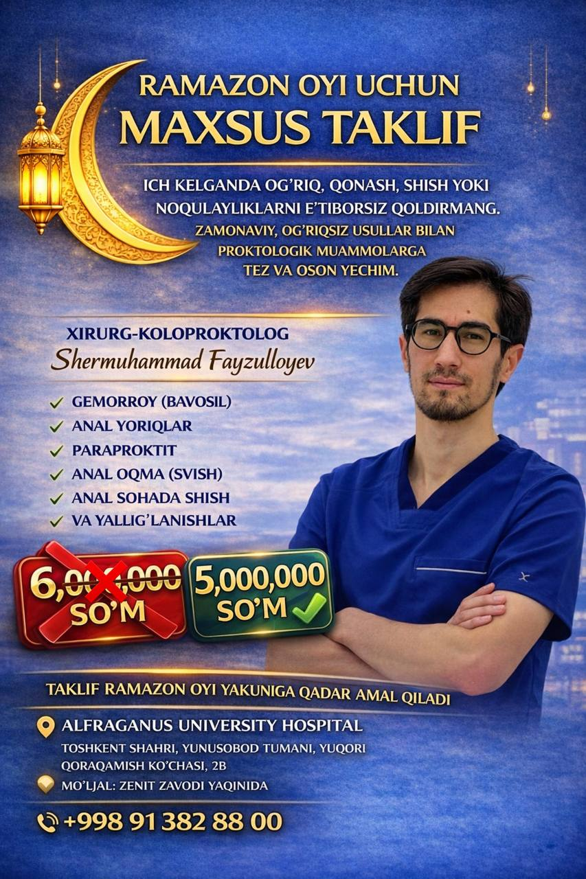 Erkaklar orasida uchraydigan barcha proktologik kasalliklarni zamonaviy usullar bilan davolaydi. Lazer va kam invaziv muolajalar qo‘llaniladi, operatsiyadan keyin tez tiklanish ta’minlanadi.